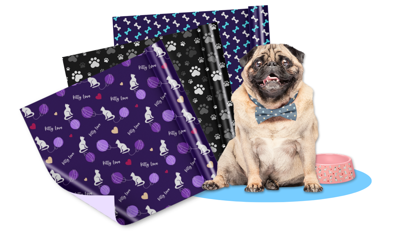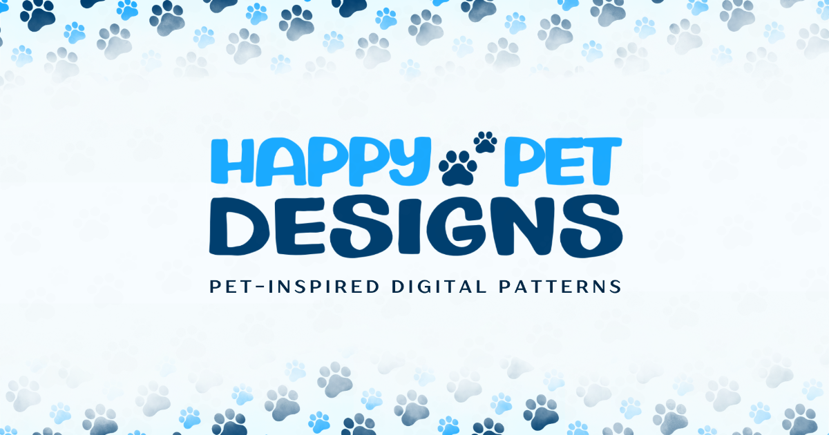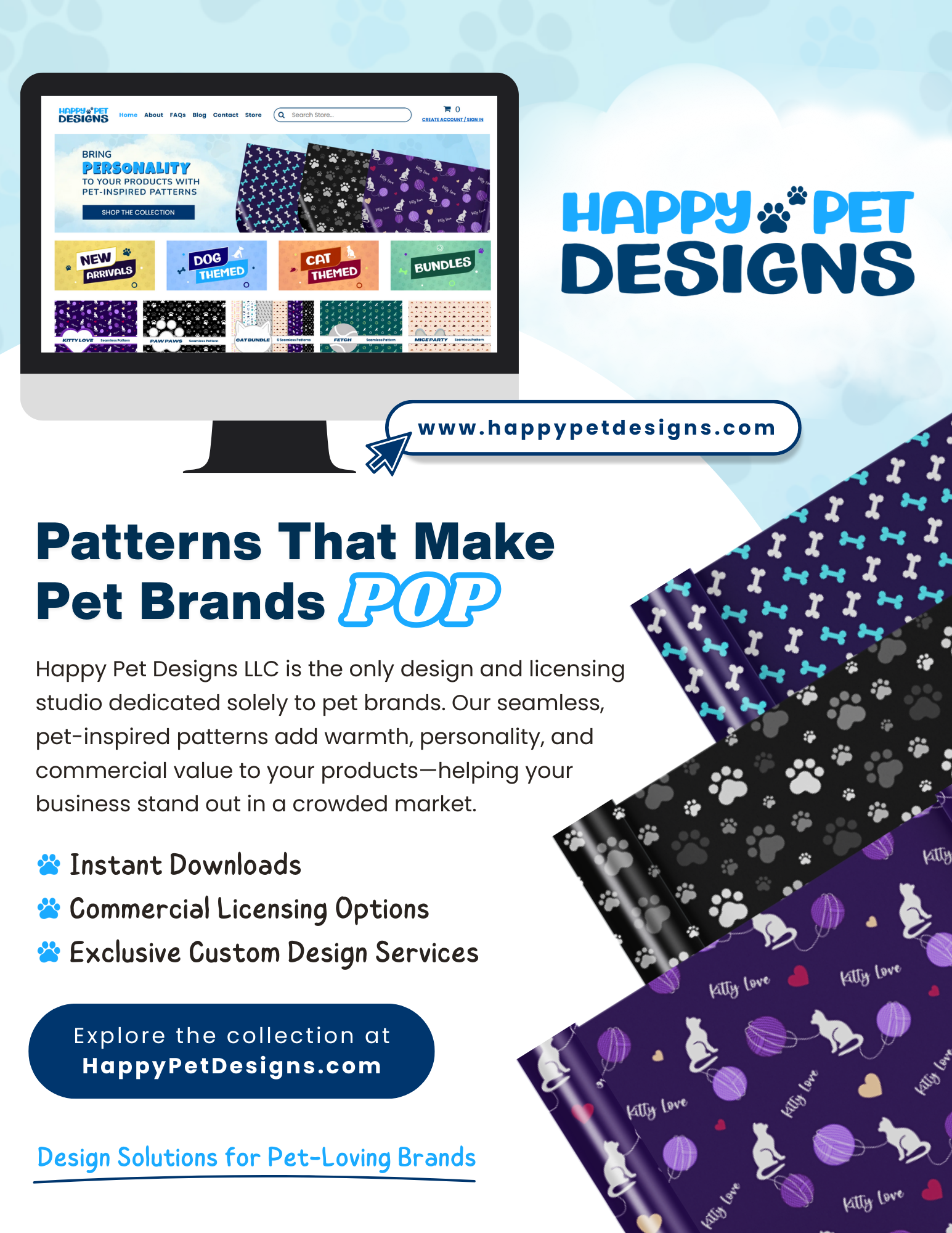 The layout was designed to feel dynamic yet easy to navigate. A website mockup displayed on a desktop screen builds credibility and shows visitors exactly where they can browse the collection. Layered pattern previews—featuring dog bones, paw prints, and cat-inspired illustrations—create depth and movement while showcasing the variety and versatility of the designs.